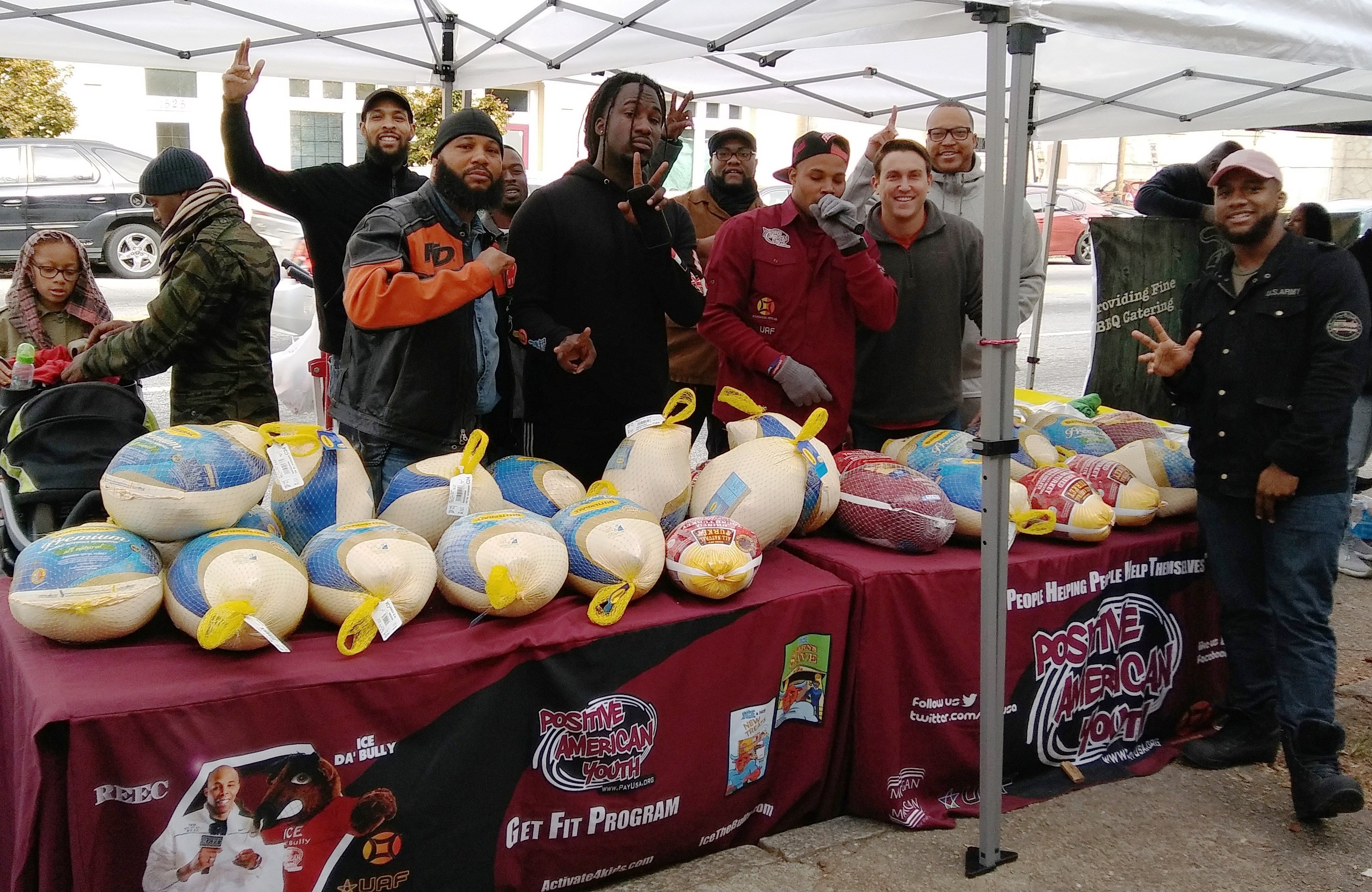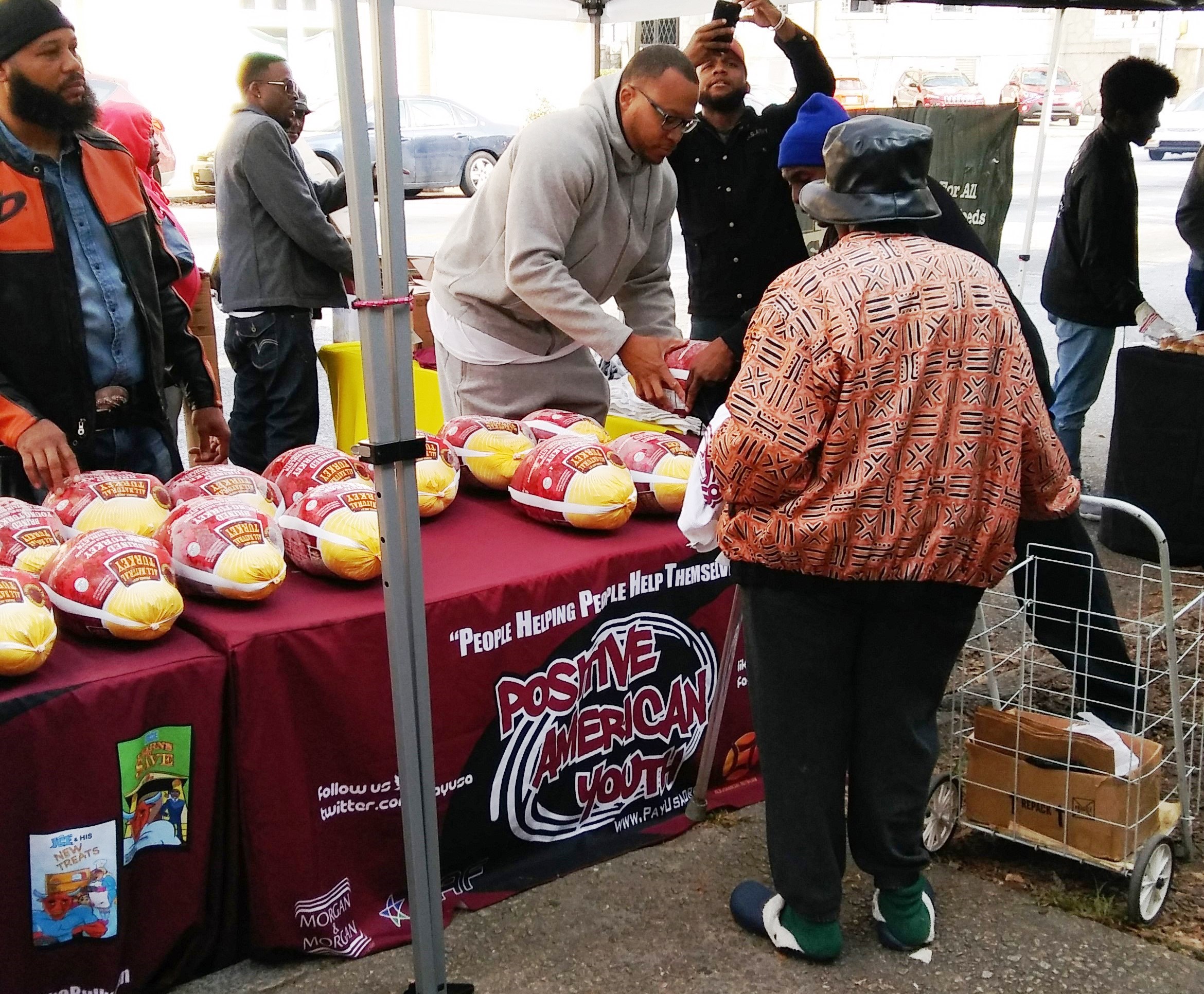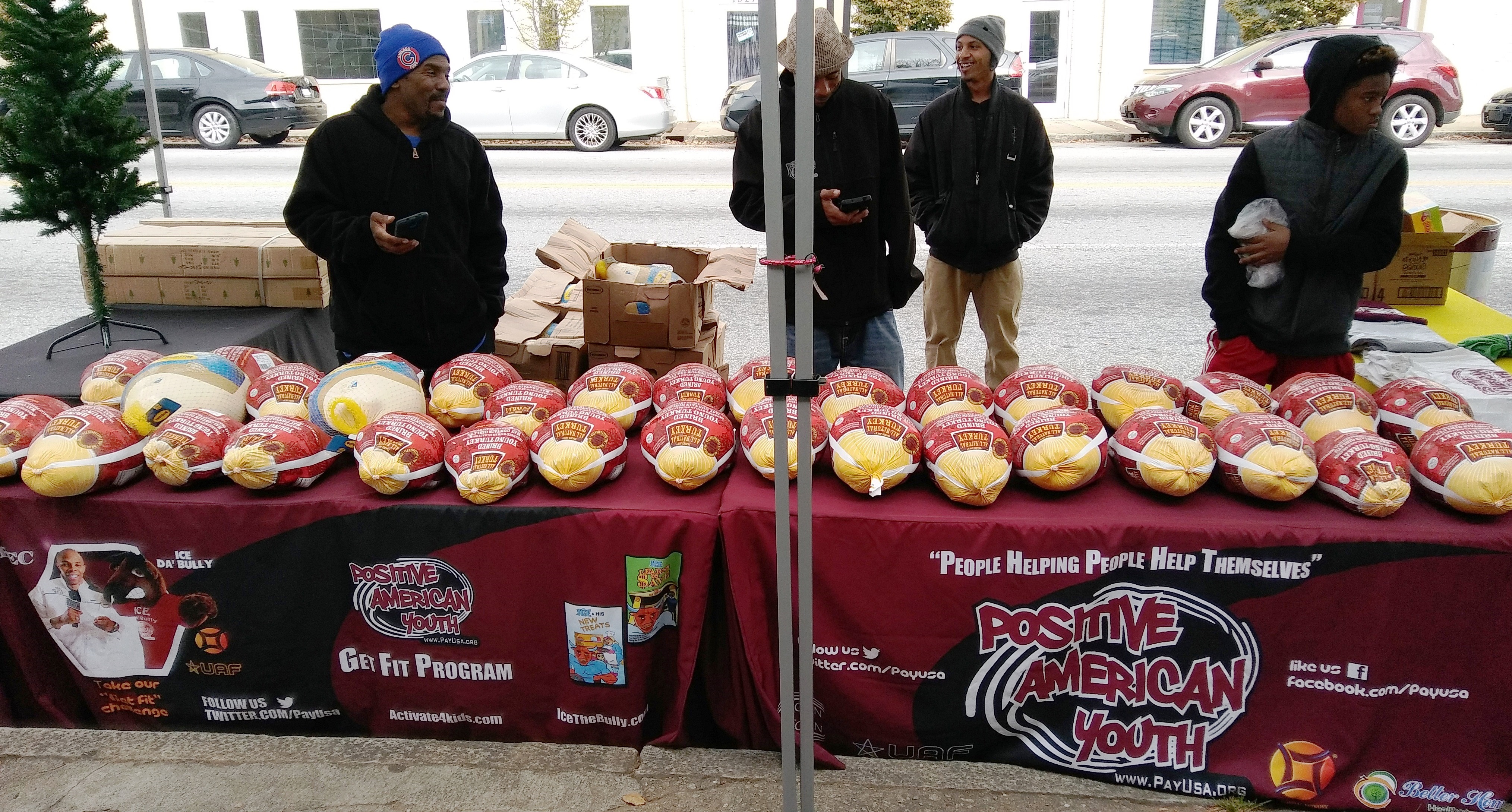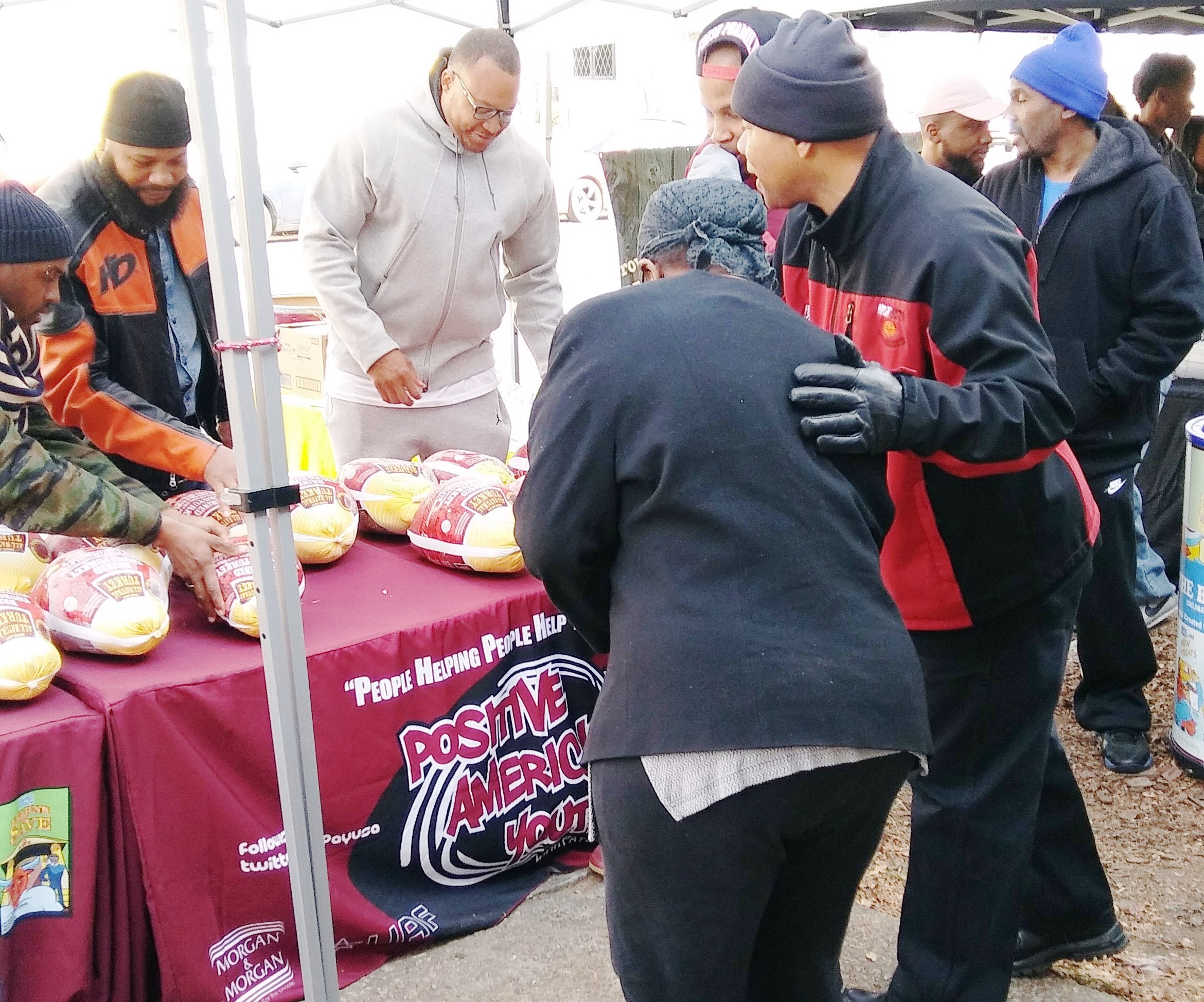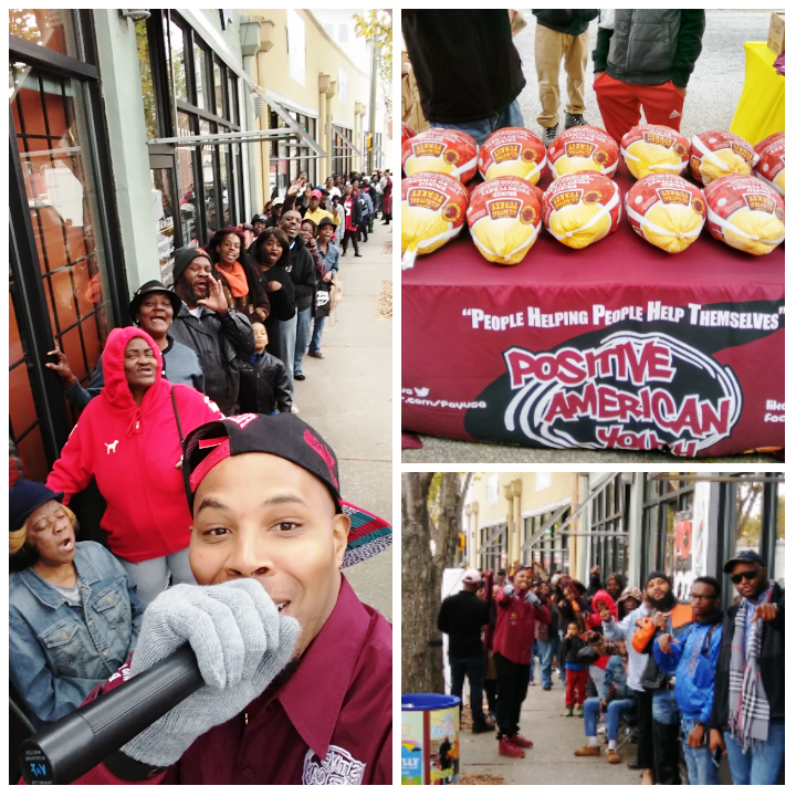 Positive American Youth was able to supply hundreds of families in need with free frozen turkeys just in time for the holidays! Reec of Hot 107.9 kept the crowd entertained along with Dj Deceptacon. Mike Smoake, CEO of Smoake & Bones BBQ, provided the crowd with delicious treats hot of of the grill for free! 77 Families also received holiday trees and ornaments courtesy of For Prints Call Us. The event was sponsored by Attorney Justin D. Miller of Morgan & Morgan Law & Powered by Positive American Youth