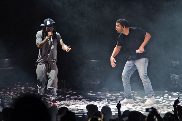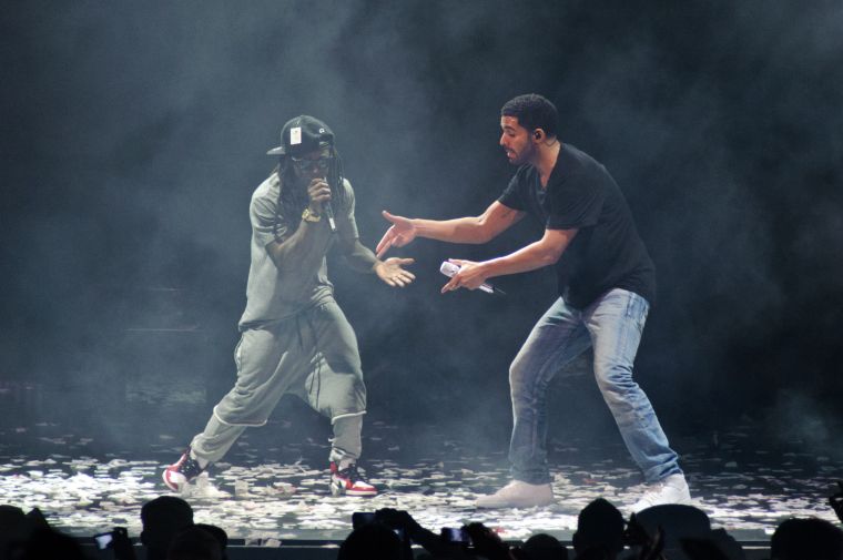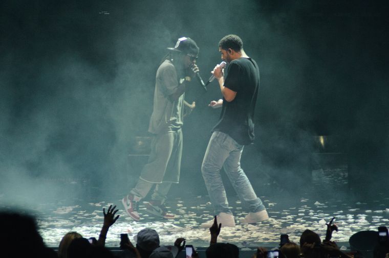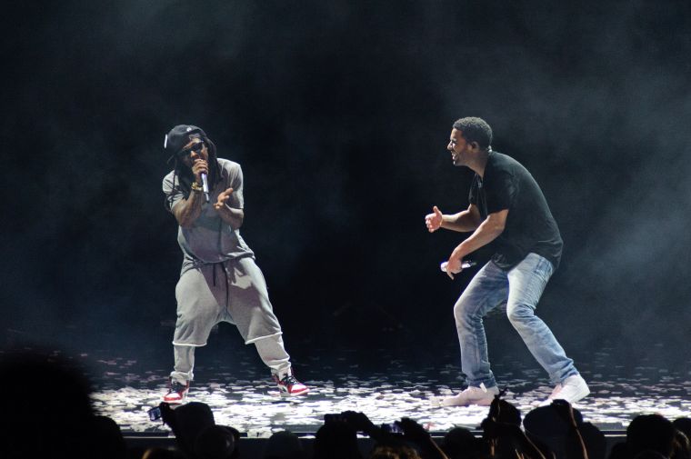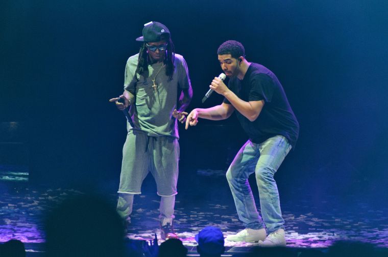 Drake and Lil Wayne perform at First Midwest Bank Amphitheatre on August 10, 2014 in Tinley Park, Illinois. (Photo by Timothy Hiatt/Getty Images)