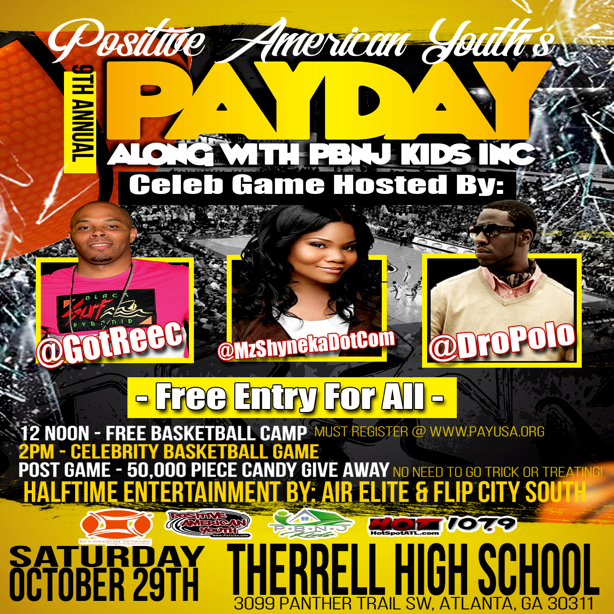 Click the picture to preregister your child for the FREE basketball camp for kids age 6 – 12. 12 Noon – Free Basketball Camp – Must Register at www.PayUsa.org 2pm – Celebrity Basketball Game – Halftime by Air Elite Dunkers & Flip City South Post Game – 50,000 Piece Candy Give Away! Celebrity game features […]