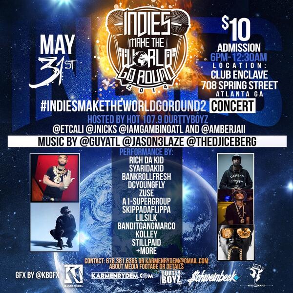 #IndiesMakeTheWorldGoRound2 Concert brought to you by @IamGambinoATL! about to be the biggest indy concert in Atlanta May 31st at Club Enclave 708 Spring Street Atlanta Ga. many names such as SyAriDaKid x BanditGangmarco x RichDaKid x Zuse x BankRollFresh x DcYoungFly x A1SuperGroup and More. DurttyBoyz has broken many indies in the city and this […]